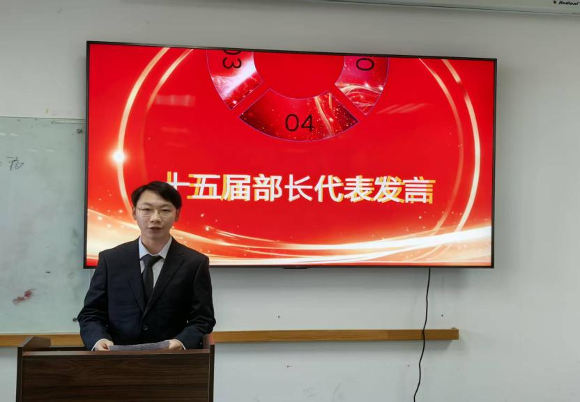 第十五届部长代表王文榜从部门职责出发,表达了立足岗位、精益求精的决心,承诺将以专业的态度、高效的行动为学生会工作添砖加瓦。