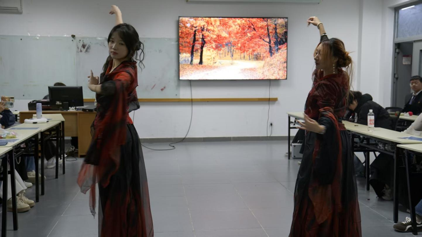 音乐里的古筝声一响起,她们就像两片花瓣一样轻轻舞动。旋转时裙摆像盛开的花,抬手时像在接住飘落的叶,每一个动作都温柔又灵动。