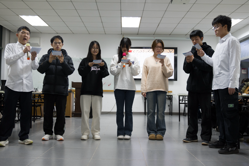 7位同学携手登台,带来一场充满力量感的朗诵表演。集体的声音汇聚成青春的洪流,直击心灵,让人热血澎湃。