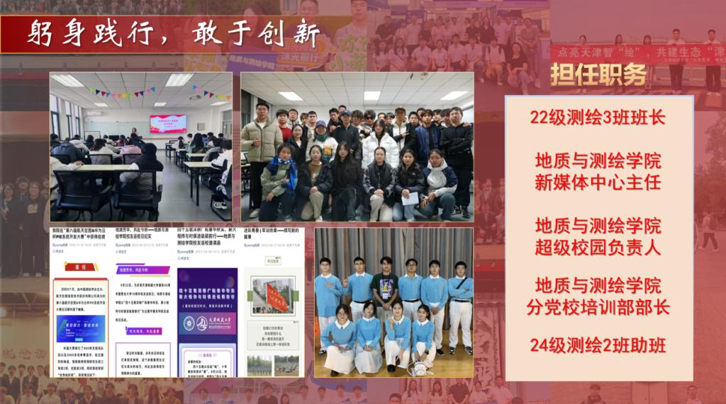 知行合一,以青春赴使命。他赴延安研学淬炼初心,在革命热土感悟延安精神的时代光芒;走进田间地头参与助农直播,用实干助力乡村振兴;投身生态文明实践行,以专业所长守护绿水青山;参加“返家乡”社会实践,在基层一线增长才干;服务于天津市马拉松赛道,展现青春奋进姿态。担任天城大地测科普基地讲解员,他累计参与社会实践20余项,志愿服务时长超600小时,把理论学习的收获转化为解决实际问题的能力,以脚步丈量责任,用行动书写担当,真正做到以知促行、以行践知,在服务人民与奉献社会中实现青春价值。