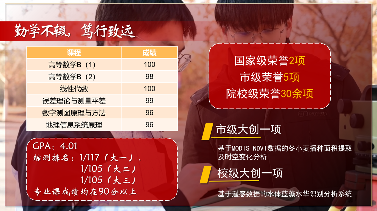 为充分发挥优秀师生群体的榜样引领作用,激励广大地测师生向优秀看齐、与优秀同行,我院特打造“身边的榜样”专题栏目,挖掘在各领域出色的师生榜样,发挥榜样典型的力量。今天特邀22级国家奖学金获得者张阳豪学长进行个人分享,让我们一起向榜样看齐吧!